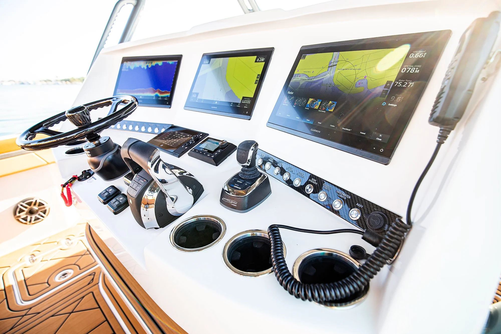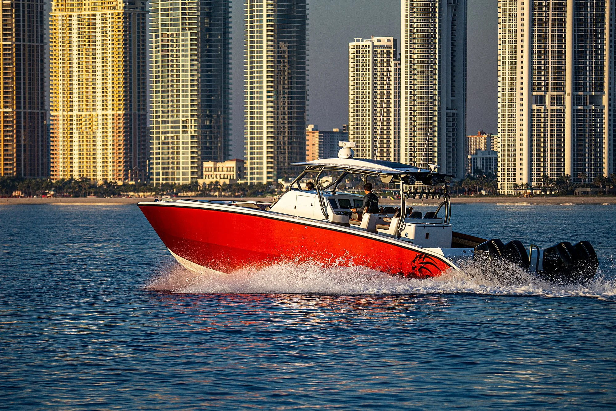 Completed just in time for the Miami International Boat Show, this 2023 Prowler 42 is powered by quad Mercury Racing 450Rs, loaded with every upgrade, and features a unique and striking color scheme, both inside and out.